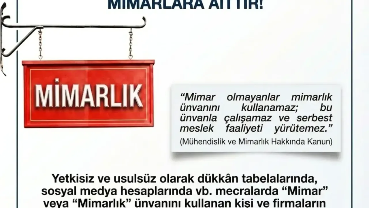 Mimarlar Odası Bursa Şubesi, 3458 sayılı Mühendislik ve Mimarlık Hakkında Kanun'un ilgili maddelerine atıfta bulunarak, yetkisiz kişilerin 'Mimar' unvanını kullanmasına karşı yasal işlem başlatılacağını duyurdu. Oda, bu tür kullanımların tespiti halinde hukuki süreçlerin devreye gireceğini belirtti.
